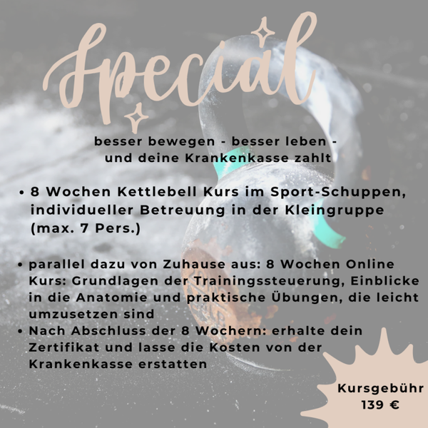 - 8 Wochen Kettlebell Kurs im Sport-Schuppen, individueller Betreuung in der Kleingruppe (max. 7 Pers.)